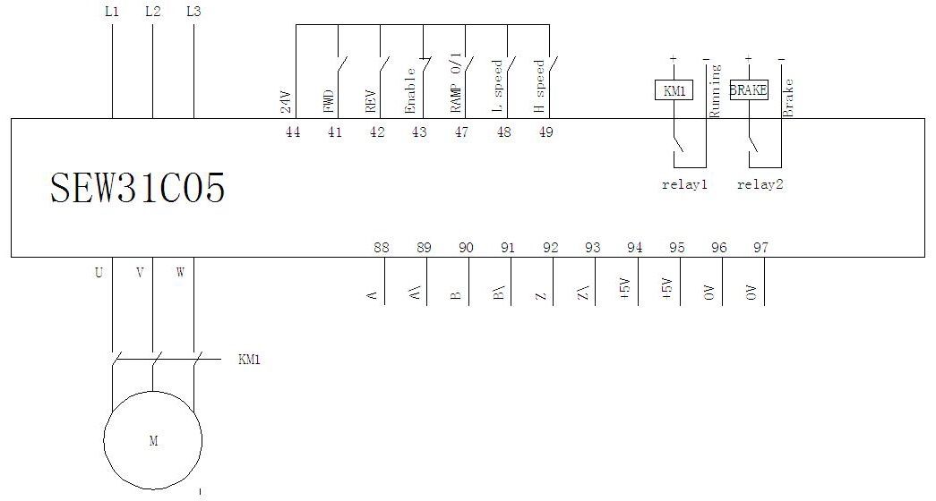 堆垛機是整個自動化立體倉庫的核心設(shè)備,通過手動操作、半自動操作或全自動操作實現(xiàn)把貨物從一處搬運到另一處。它由機架(上橫梁、下橫梁、立柱)、水平行走機構(gòu)、提升機構(gòu)、載貨臺、貨叉及電氣控制系統(tǒng)構(gòu)成。其原有的提升機構(gòu)是通過SEW變頻器驅(qū)動的,由于SEW變頻器損壞,無法修復(fù),客戶急需生產(chǎn),所以用丹佛斯FC302系列變頻器進行替代。