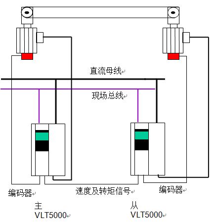 變頻器由共用直流母線供電, 丹佛斯可提供整流/回饋裝置或由用戶提供. 各分部速度可由現(xiàn)場總線提供, 也可由變頻器本身形成速度鏈. 變頻器采用速度閉環(huán)控制. 從變頻器的速度參考值由主變頻器給定. 同時主變頻器提供給從變頻器轉(zhuǎn)矩信號. 從變頻器根據(jù)其轉(zhuǎn)矩與主變頻器的差別, 動態(tài)修正從變頻器的轉(zhuǎn)速, 從而保證兩個變頻器出力一致. 所有運(yùn)算通過可自由編程的工藝控制卡實(shí)現(xiàn).