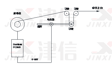 如圖中所示;設(shè)備主要包含導(dǎo)輪支架,0-10V電位器,收卷電機,丹佛斯FC360變頻器。FC360根據(jù)擺桿位置反饋控制放卷電機的轉(zhuǎn)速快慢和方向正反,使得放線速度和牽引速度保持同步,并使得擺桿在某個位置穩(wěn)定,放線速度穩(wěn)定恒速。