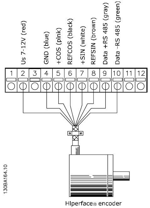 丹佛斯編碼器選件卡MCB102支持長線驅動增量形編碼器、EnDat絕對位置編碼器、SSI絕對位置編碼器和HIPERFACE接口編碼器。當接HIPERFACE接口編碼器時,接線圖如圖2所示。