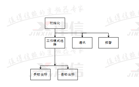 開機后,首先進行程序的初始化。初始化完成后同時調(diào)用工作模式選擇、報警和PLC與變頻器之間的通訊程序。工作模式中,包含手動出標、自動出標兩種狀態(tài)。報警程序用于對機器狀態(tài)進行實時監(jiān)控,并根據(jù)故障情況執(zhí)行相關(guān)動作。